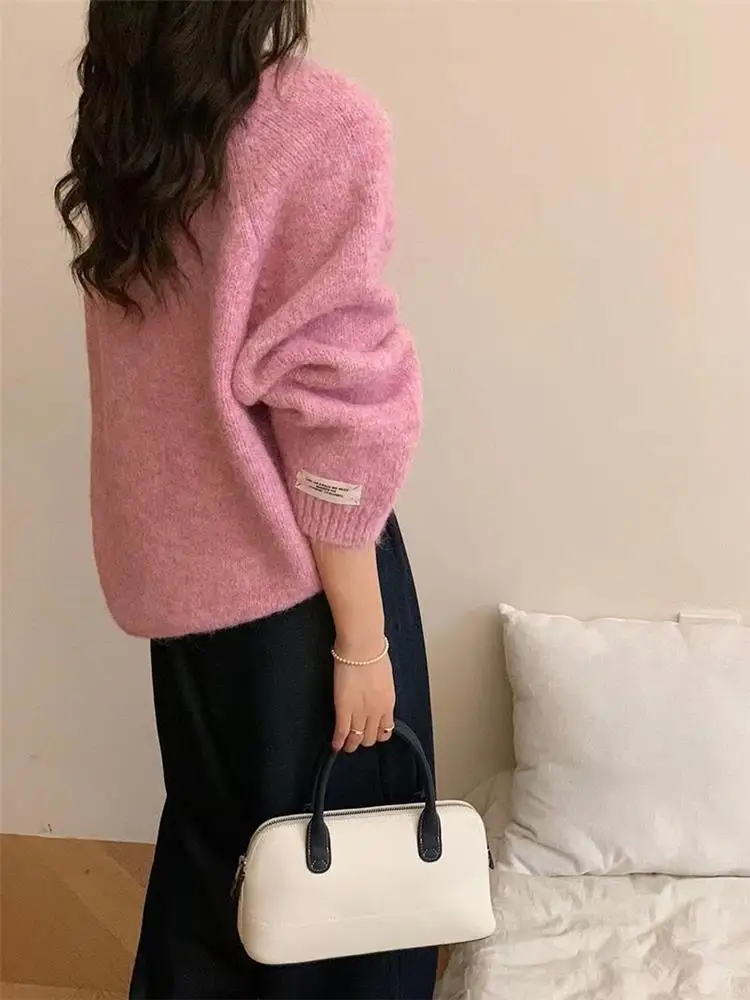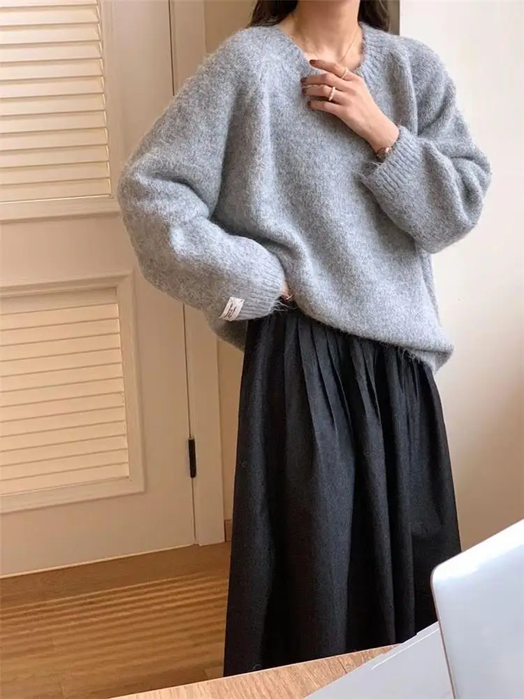 The mint green lazy style milk blue sweater features a loose fit design, offering comfort and style for everyday wear.